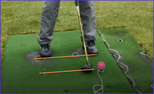 打席マットの上にクラブ2本(または真っすぐな棒等)を、狙う方向に対し、線路のように平行に置きます。