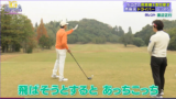 スイングは等速、つまり後半を速くなどとしない。顔を動かさない、両肘を体に付けて。